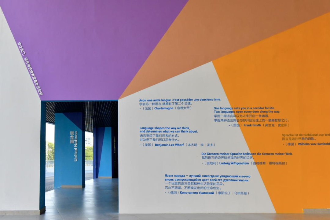 上海外国语大学三亚附属中学语言博览馆设立在我校智圆楼,自下而上共分为四大板块:联合国、语言与艺术、语言与文化、音乐和舞蹈的语言。