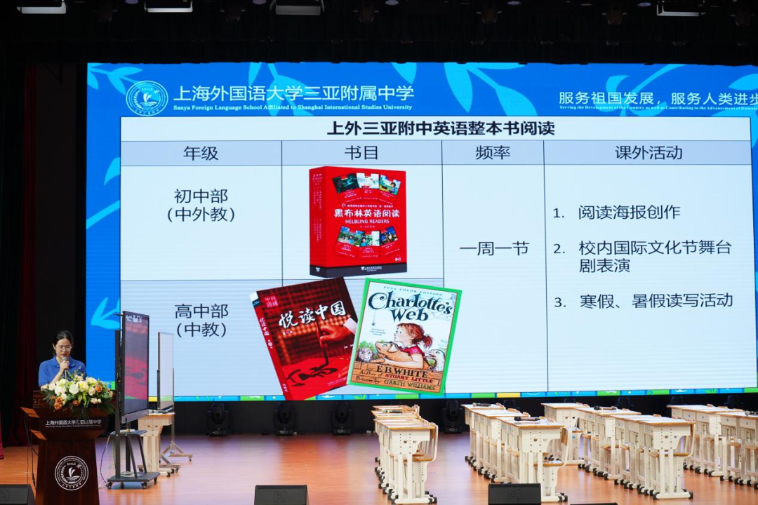 会上,英语教研组长彭萧洁老师向与会者介绍我校整本书阅读开展情况:初中阅读书籍为“黑布林”系列书籍,高中阅读书籍为“悦读中国”系列书籍;初中部采用中外教师双师课堂模式授课,高中部则由中教老师负责上课、专注经典名著的阅读;我校整本书阅读教学不局限于课堂教学,还为学生提供了非常丰富的阅读活动,并且有海报创作、校内国际文化节舞台剧表演以及寒暑假阅读活动。