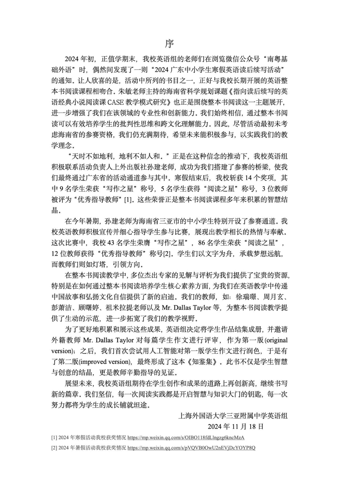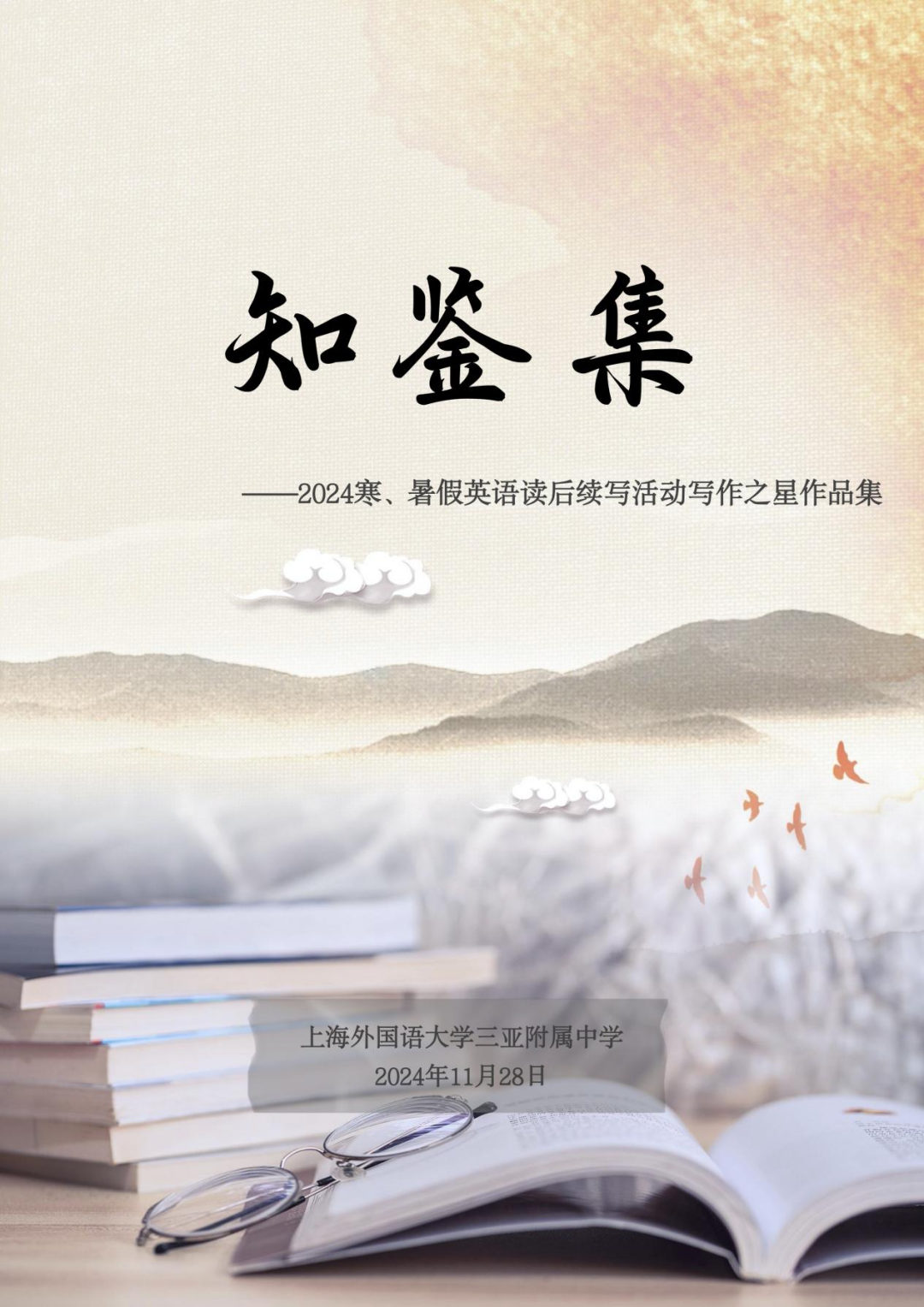 在教学总监沈建平老师的带领下,我校教师将学生对整本书深入阅读后的理解和感悟创作出的作品,收集整合,编成《知鉴集》。《知鉴集》不仅为学生提供了一个展示自己阅读成果和批判性思维能力的平台,也帮助教师洞察学生的思维过程、评估他们的阅读理解能力,同时,它为教学评价一体化提供了丰富的研讨素材。