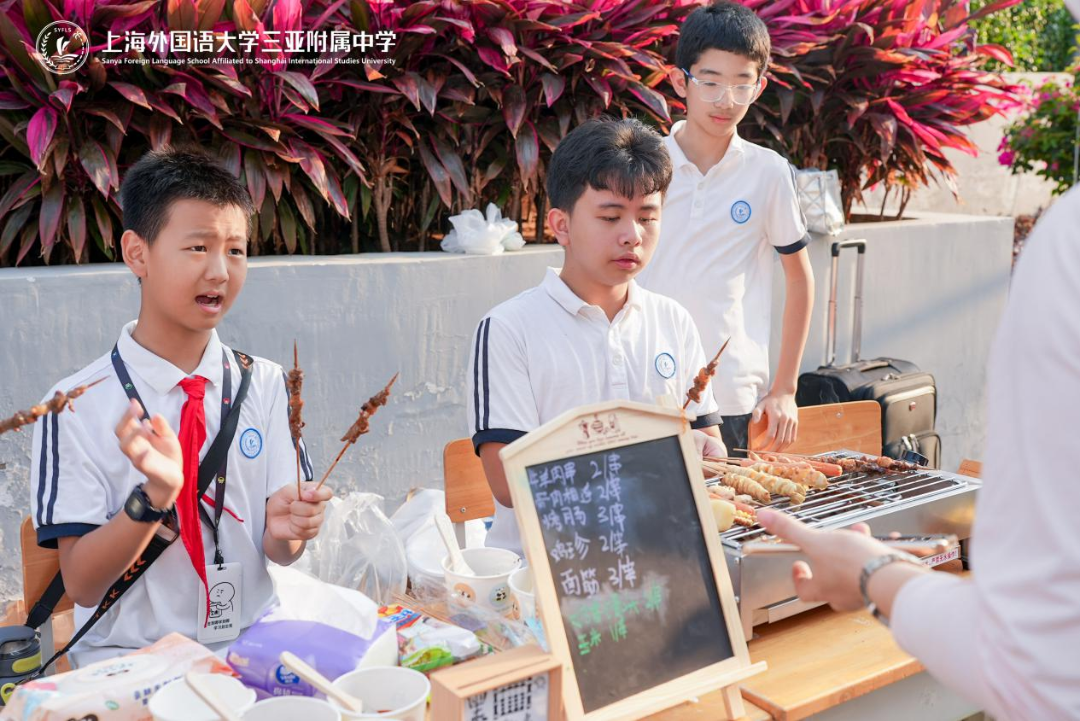 穿梭在热闹的街市上,芳香四溢的美食让人垂涎欲滴。新疆烤肉串、海南粉、清补凉、川渝小火锅以及各类传统饮品甜点,数不胜数。你会发现摊主不仅有身着特色服饰的学生,忙前忙后的家长,也有课堂一把手的老师们……大家在方寸摊位间精心烹制一道道色香味俱全的家乡风味或个人拿手好菜,引得往来“食客”纷纷驻足品尝。