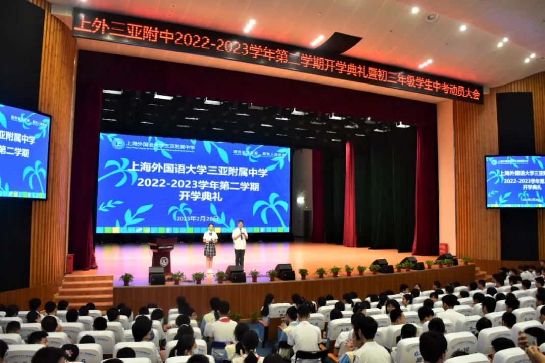 崭新的晨光,迎来全新的开始,2023年2月20日早上,迎着和煦的春风,上外三亚附中全体师生齐聚一堂,拉开了2022-2023学年第二学期开学典礼暨初三年级中考动员大会的帷幕。方正明书记,朱玮雪校长,董方副校长、黄旭副校长和刘敏副校长出席了典礼。 开新篇,立新志升旗仪式上,英姿挺拔的国旗护卫队队员们,紧握国旗,齐步走向舞台中央。当国歌声响起,全体师生肃立,少先队员行队礼,上外三亚附中在庄严...