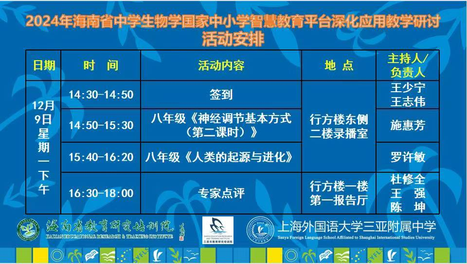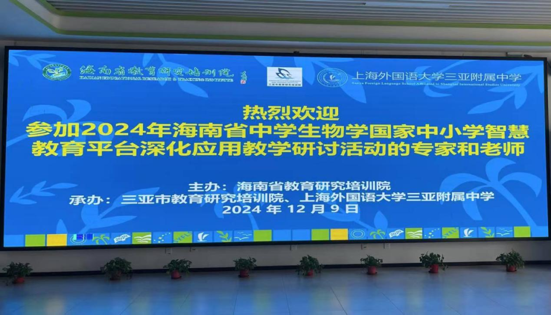 编者按:在教育数字化转型的浪潮中,上海外国语大学三亚附属中学积极探索创新教学模式,助力教育高质量发展。2024年12月9日,由海南省教育研究培训院主办,三亚市教育研究培训院、上海外国语大学三亚附属中学承办的“2024年海南省中学生物学国家中小学智慧教育平台深化应用教学研讨活动”在我校成功举办。此次活动吸引了全省各市县七十余位生物教师参与,共同探讨智慧教育平台在生物学教学中的深度应用,为教育教学改革注入新活力。