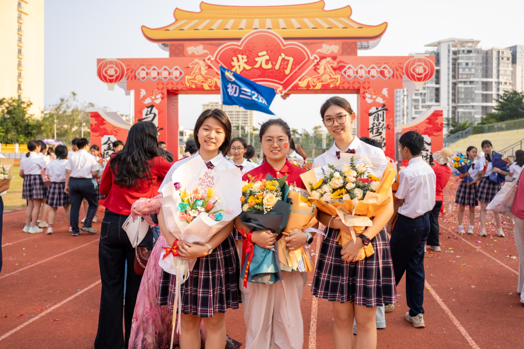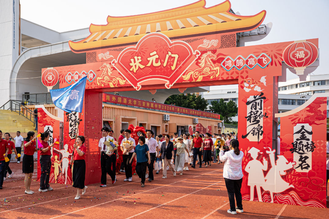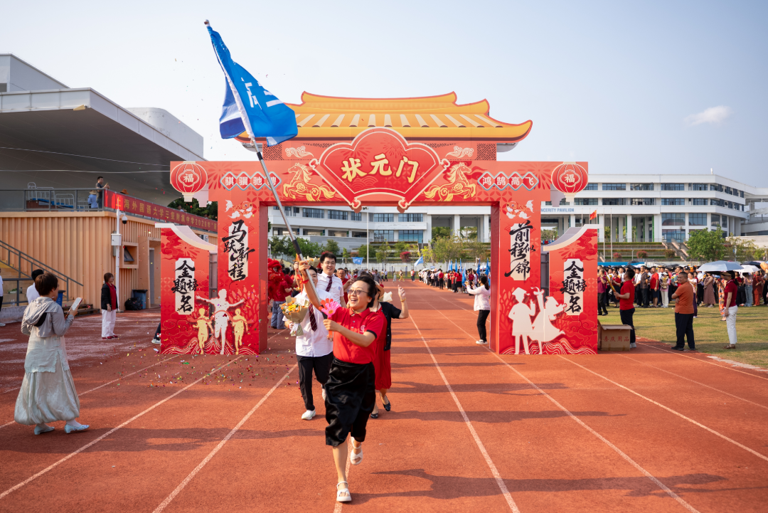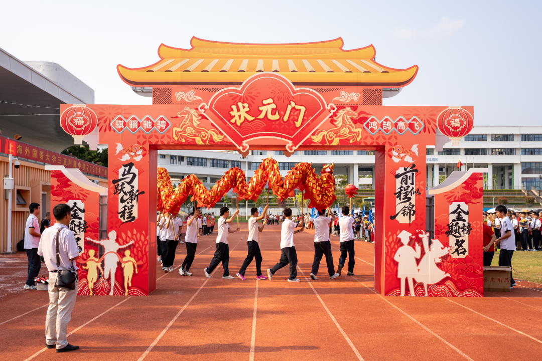 最振奋人心的“鱼跃龙门・过状元门”环节重磅登场。气派恢弘的“状元门”矗立在田径场中央,舞狮队欢腾助兴、喜气洋洋;家长代表手持加油牌暖心守候,全体教师佩戴红围巾列队护航,校领导和全体中层干部引领在前,与学子击掌鼓劲,为学子们送上最真挚的祝福。