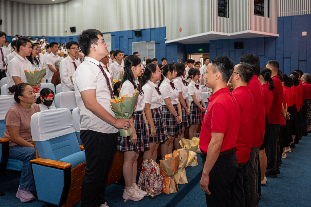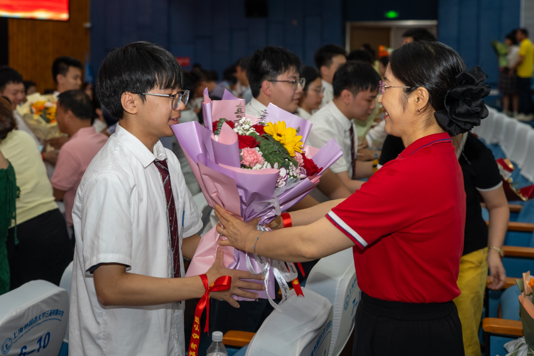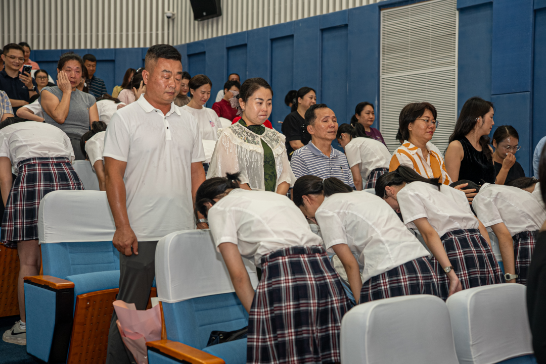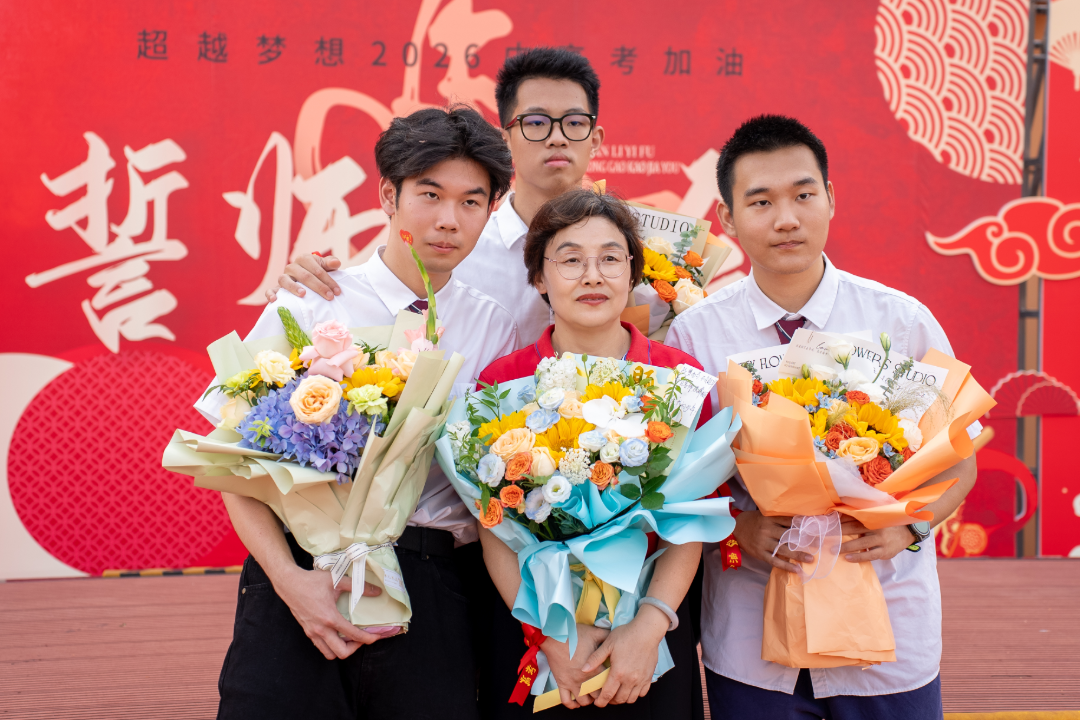 温情献花环节将现场氛围推向温暖高潮。高三学子手捧鲜花,依次献给默默守护自己的父母与悉心教诲的师长,以一束鲜花、一个鞠躬,道尽感恩之情。师生相拥、家校共情,定格下青春里最动人的温暖瞬间。