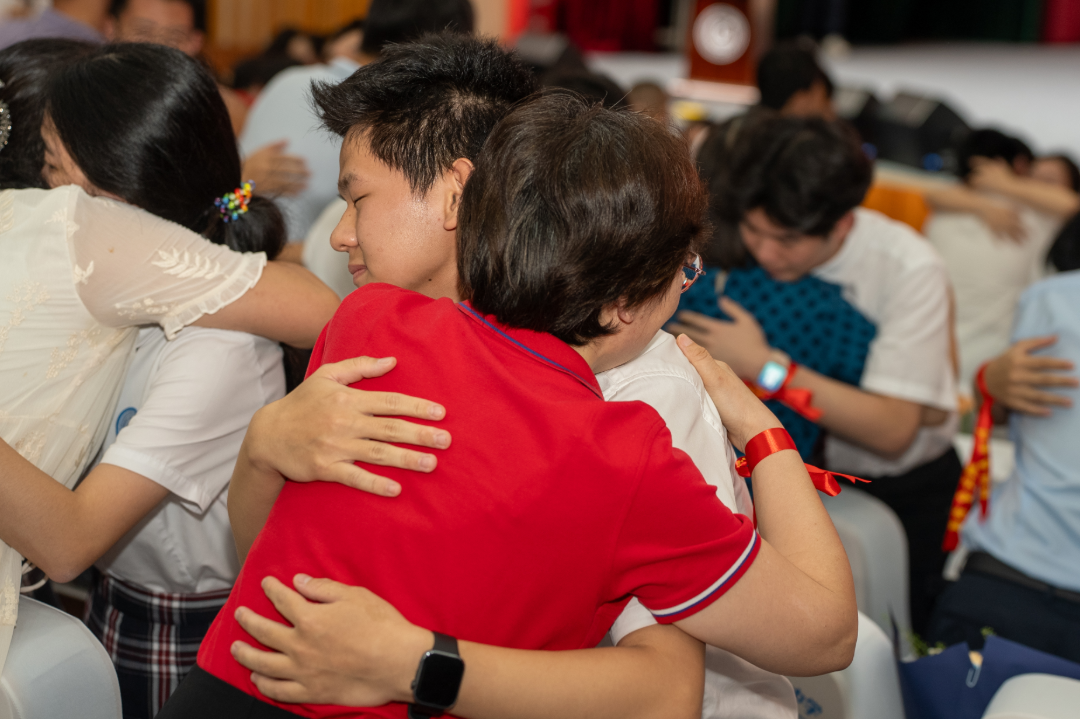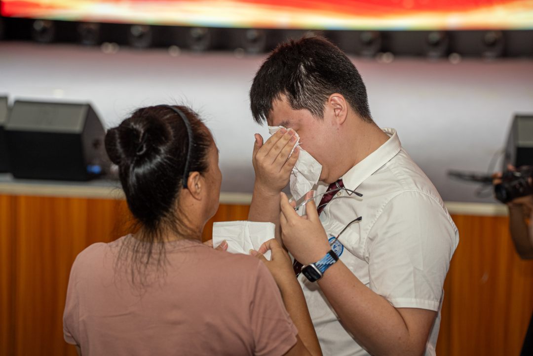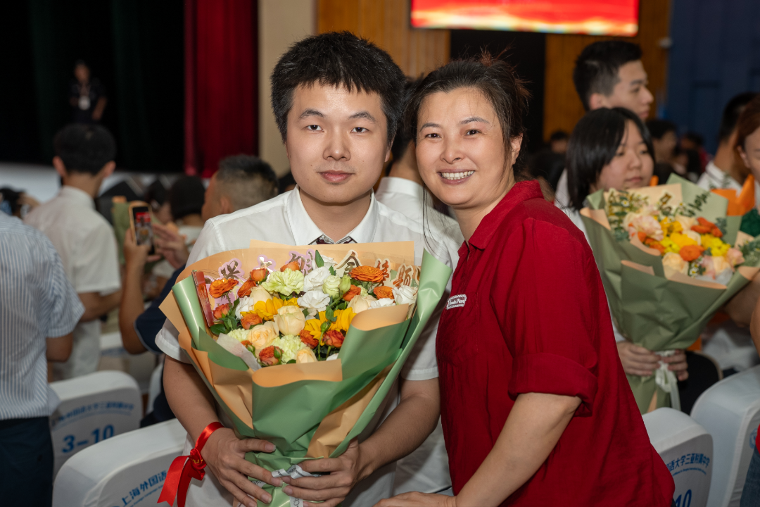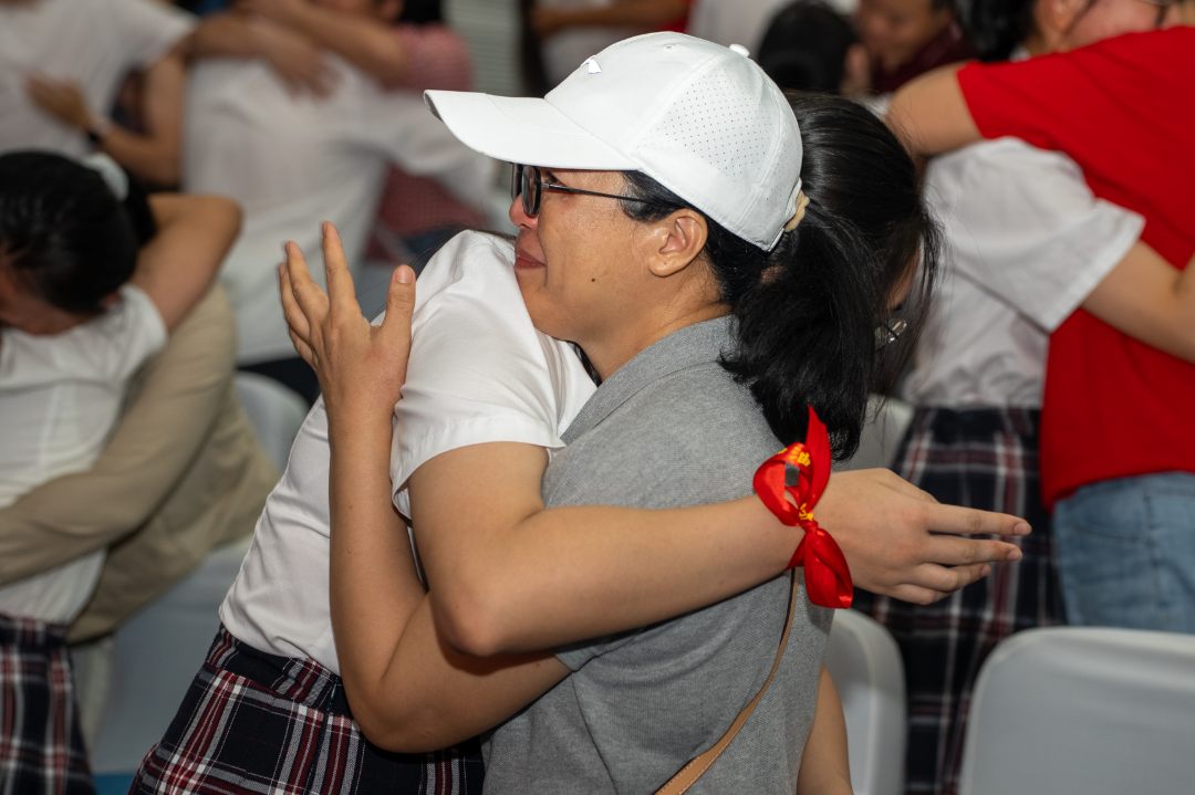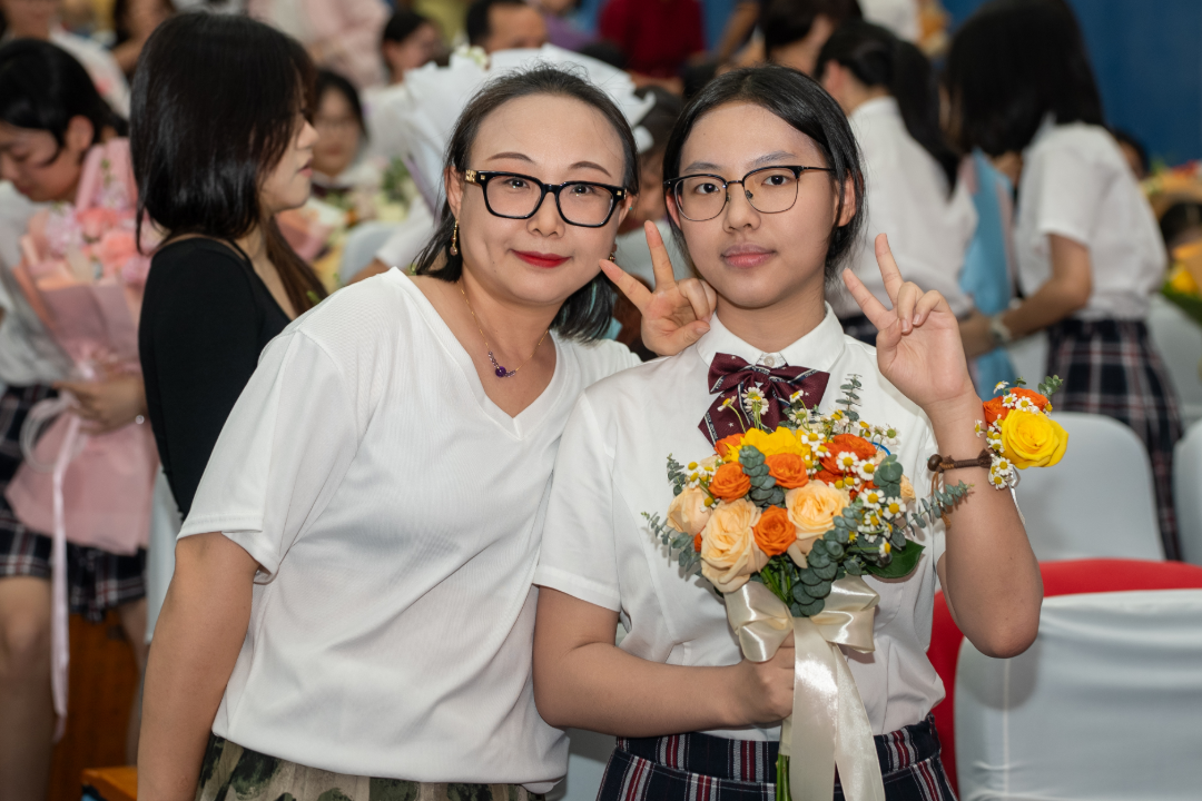 温情献花环节将现场氛围推向温暖高潮。高三学子手捧鲜花,依次献给默默守护自己的父母与悉心教诲的师长,以一束鲜花、一个鞠躬,道尽感恩之情。师生相拥、家校共情,定格下青春里最动人的温暖瞬间。