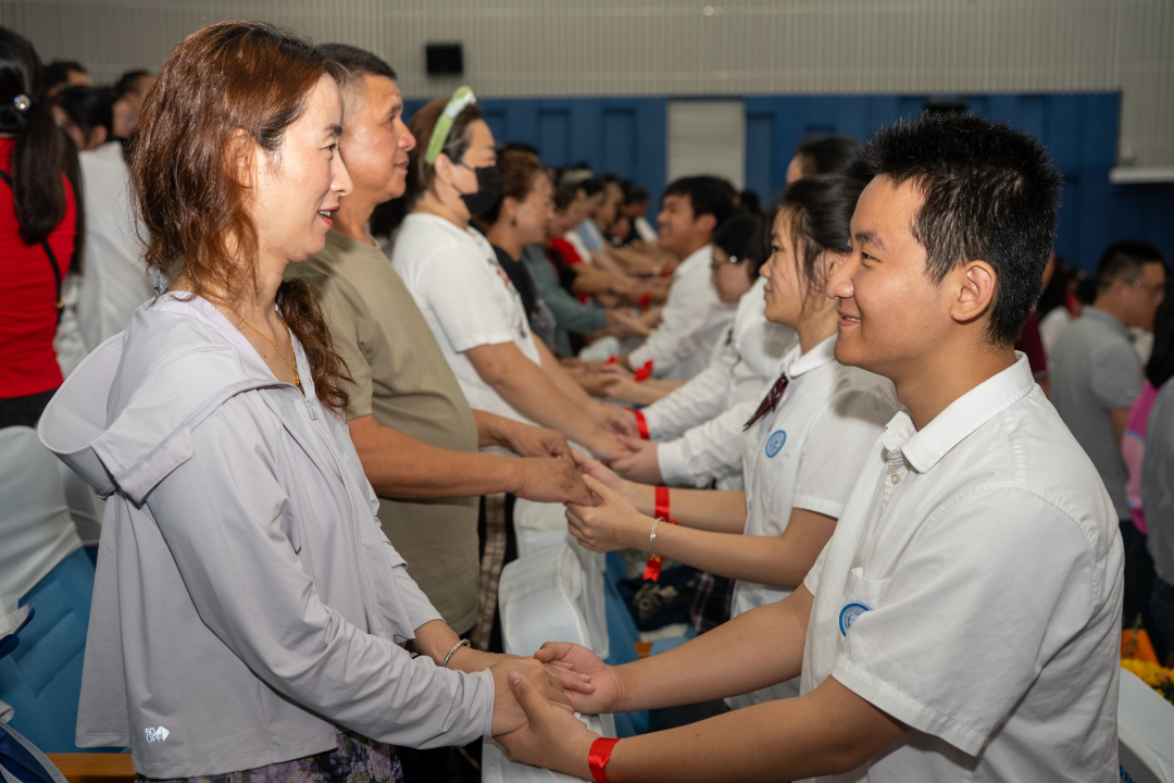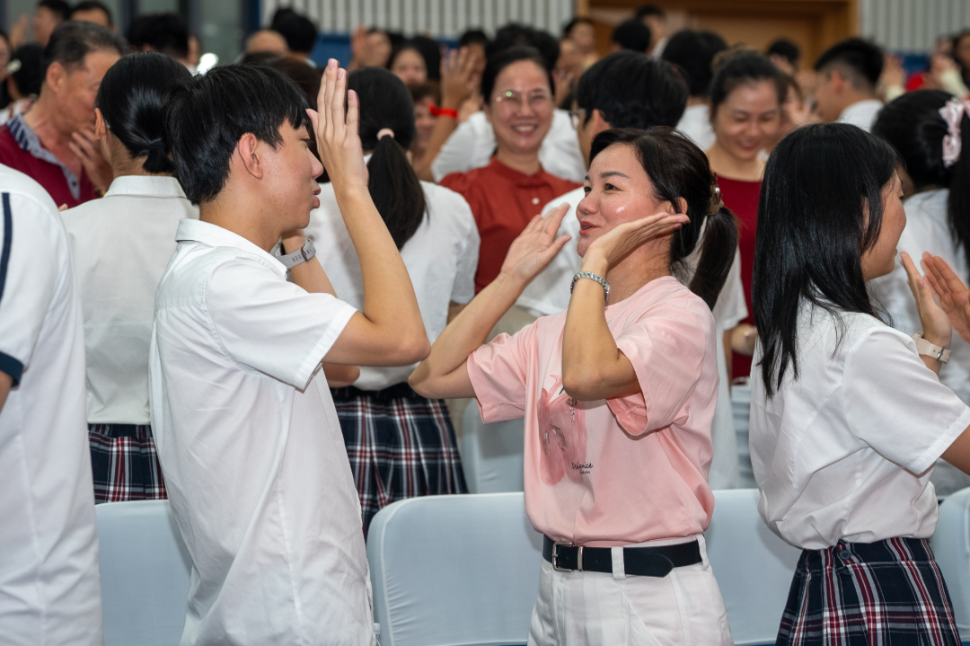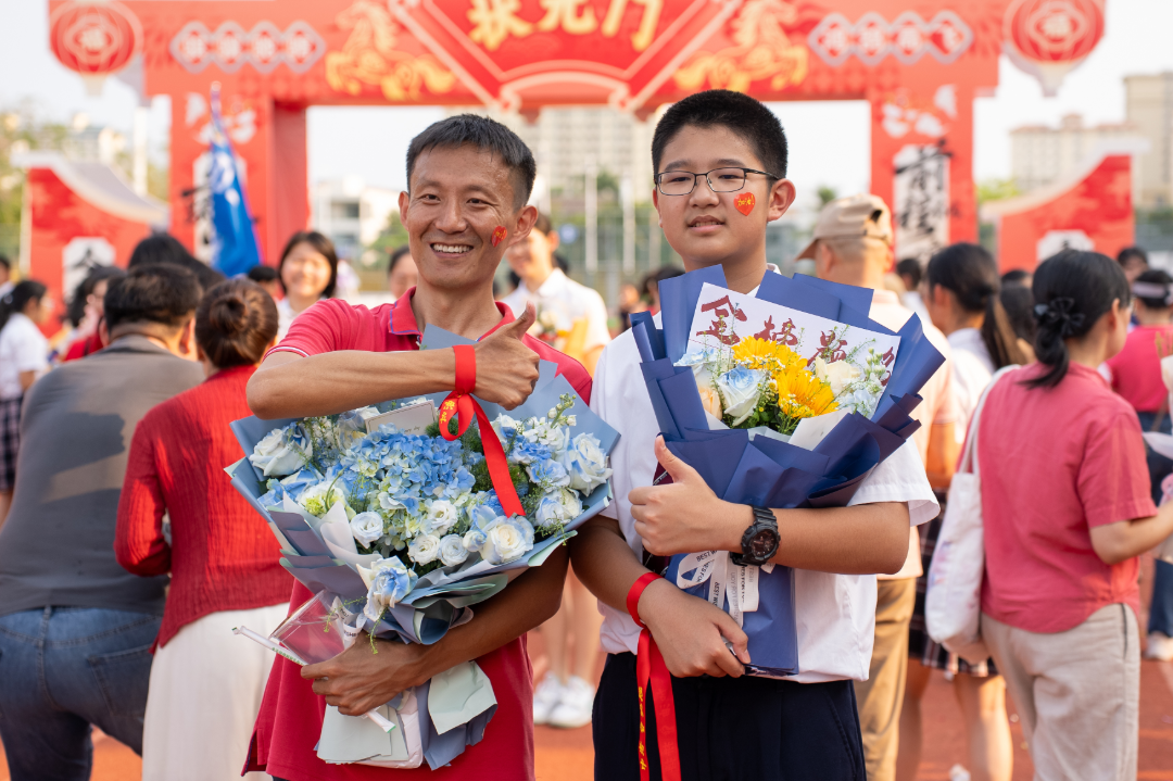 紧接着,初三学子同样以献花致敬父母与恩师,感恩一路陪伴与守护。在全场倒计时的欢呼声中,校领导与年级代表共同为启动仪式揭幕,五彩礼花腾空绽放,象征着希望与勇气的誓师仪式正式启航,全场掌声、欢呼声经久不息。