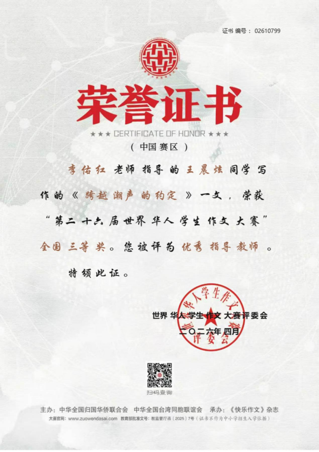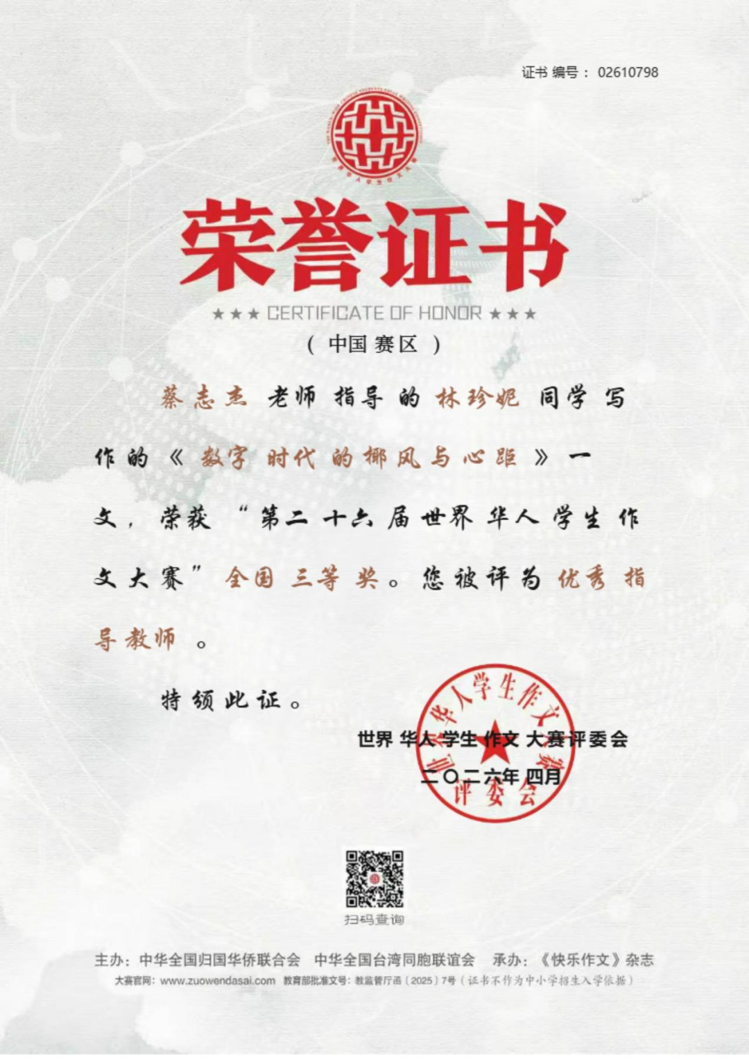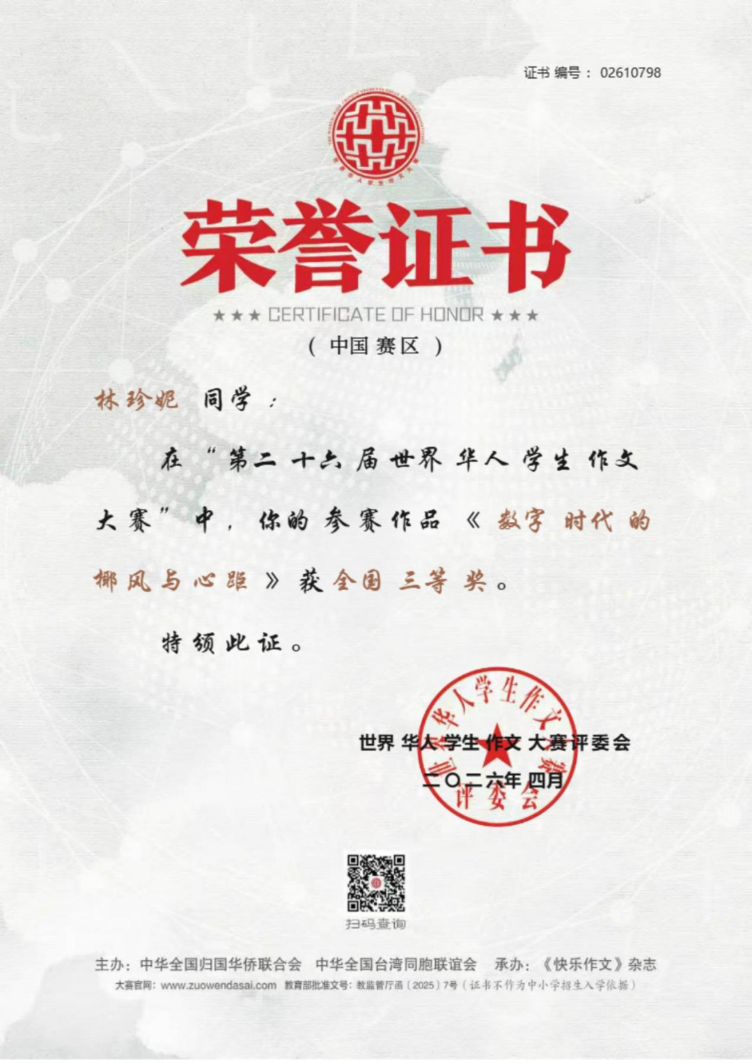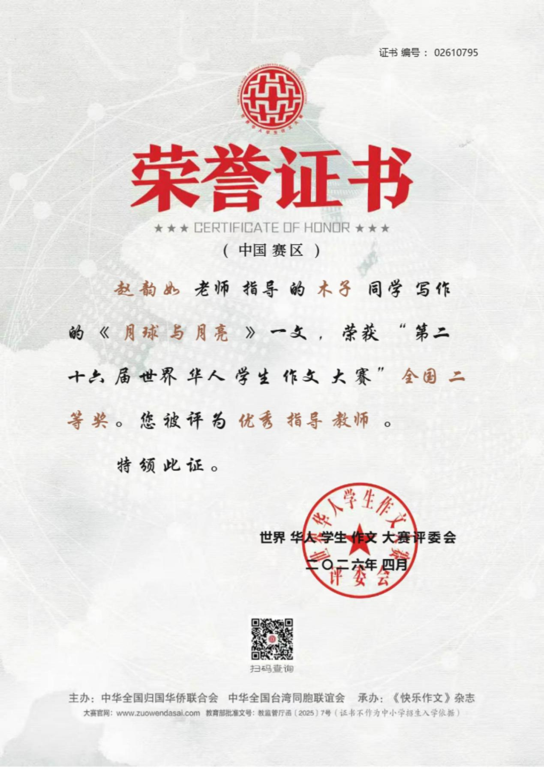 近日,上海外国语大学三亚附属中学捷报频传,学子在国家级文学赛事、全国体育竞技赛事、全国地球科学奥赛及市级艺术展演中接连斩获重磅殊荣,于笔墨书香中绽放人文光彩,在竞技赛场彰显少年锋芒,以卓越的综合素养交出亮眼青春答卷,充分彰显了学校“培养外语见长、文理并举、五育兼备、创新型、复合型、 高素质的国际型预备英才”的育人理念与丰硕的办学成果。 笔底藏山河,青春著华章。在刚刚公布评选结果的第二十六届世界华人学生作文大赛(教育部白名单赛事)中,我校学子不负众望、再创佳绩,共有 7 名学生斩获国家级奖项。其中,高二 (2) 班沈浩年、高二 (7) 班栗梓淇荣获国家级一等奖;高二 (2) 班木子、林毅荣获国家级二等奖;高三 (2) 班王晨炫、高二 (2) 班高凡、高二 (7) 班林珍妮荣获国家级三等奖。赵韵如、蔡志杰、李佑红老师荣获本次大赛优秀指导老师奖。 我校学子获奖证书 上下滑动查看更多图片 优秀指导老师获奖证书 上下滑动查看更多图片 世界华人学生作文大赛作为教育部认可的全国性权威赛事,为广大青少年搭建了展现文学素养、抒发青春心声、表达思想深度的广阔平台。我校学子在赛事中脱颖而出、斩获多项殊荣,既展现了学生们出众的文字功底、丰厚的人文积淀与开阔的视野格局,也凝结着我校语文组全体教师深耕课堂教学、潜心育人育才的辛勤付出,更是学校长期重视学生核心素养培育、厚植校园人文底蕴的生动成果体现! 碧波逐风浪,少年勇争锋。在 2026 年全国蹼泳 U 系列比赛中,我校初三 1 班李睿轩同学代表三亚市出征赛事。赛场上,他凭借日复一日打磨的扎实专业功底、稳定出色的临场发挥与奋勇争先的竞技状态,力克群雄、脱颖而出,一举包揽 U17 组 50 米双蹼、100 米双蹼、200 米双蹼三个项目的全国冠军,以绝对实力登顶赛事最高领奖台。 赛场上每一次有力的划水,都凝聚着李睿轩同学常年挥洒的汗水与不舍昼夜的坚持;领奖台上的荣耀时刻,更见证着他以无畏毅力挑战自我、突破极限的体育精神。这份亮眼的成绩,既是李睿轩同学个人拼搏奋斗的青春勋章,也是我校高度重视学生身心健康与体育特长发展,持续推进校园体育工作提质增效的有力印证。 地载山河探奥秘,格物致知求真知。在刚结束的 2025—2026 年度全国中学生地球科学奥林匹克竞赛预赛(教育部白名单赛事)中,我校地理组师生奋勇拼搏,再创佳绩,获奖数量与质量均位居全省前列! 本次竞赛我校共 24 人次获奖,其中一等奖 8 人次(全省仅 20 人),二等奖 10 人次(全省仅 50 人),三等奖 6 人次(全省共 93 人),获奖占比远超全省平均水平,展现了我校强劲的拔尖人才培养实力。其中,高三(2)班邱彦博同学表现尤为突出,以全省第一名的绝对优势成功晋级全国决赛,成为全省仅有的 2 位入围国赛选手之一。魏春松、刘溪、方燕妹老师荣获本次竞赛优秀指导教师奖。 获奖名单 全国中学生地球科学奥林匹克竞赛是国内地球科学领域级别最高、影响力最广的中学生学科竞赛,旨在激发青少年对地球科学的兴趣,选拔和培养地球科学后备人才,推动中学地球科学教育改革与发展。我校学子在赛事中斩获佳绩,既彰显了学生们扎实的学科功底、严谨的科学思维与探索未知的科学精神,也凝结着地理组全体教师深耕学科教学、精准培优的心血与汗水,更是学校重视拔尖创新人才培养的生动体现! “绳”彩竞飞扬,赛事刷新绩。2026 年三亚市中小学生 “青鹿” 体育节暨第五届中小学生跳绳比赛圆满落幕,我校跳绳健儿奋勇拼搏,斩获中学组团体积分第二名。本次赛事中,我校共摘得个人奖项 15 项,其中冠军 2 项、亚军 4 项、季军 2 项;三项团体项目全部获奖,拿下 1 项亚军、1 项季军,书写了学校跳绳项目的新辉煌。 获奖学子风采展示 上下滑动查看更多图片 赛事不仅锤炼了学子的体魄与意志,更凝聚了团队力量,让 “更高、更快、更强、更团结” 的体育精神深植学子心间。 墨香润童心,展演获殊荣。在刚刚结束的三亚市 “青鹿杯” 艺术展演决赛中,我校三位学子从初赛中脱颖而出,在决赛中取得优异成绩:初一( 7) 班郑雅晴荣获初中组软笔书法一等奖,初一 (1) 班王贺荣获初中组硬笔书法二等奖,高一 (2) 班彭梦博荣获高中组软笔书法二等奖,充分展现了我校学子的艺术素养与审美能力。 上下滑动查看更多获奖作品 多项荣誉的接连斩获,是我校始终坚守立德树人根本任务,深入落实 “五育并举” 教育方针、践行“外语见长、文理并举”育人理念的生动体现。在此,学校向所有获奖学子致以最热烈的祝贺,向悉心指导的语文组、地理组、体育组、艺术组全体教师,以及长期支持学校教育工作的各位家长致以最诚挚的感谢。 少年负壮气,奋烈自有时。愿全体获奖学子珍惜荣誉、乘势而上,在各自热爱的领域再接再厉、勇毅前行;也愿全体上外三亚附中学子以榜样为力量,心怀热爱、笃行不怠,成长为德智体美劳全面发展的新时代优秀青少年! 撰稿:朱伟华、欧阳磊、徐盈、朱暖娥 编辑:石雅娴 编审:苏靖雯 审校:陈太涯