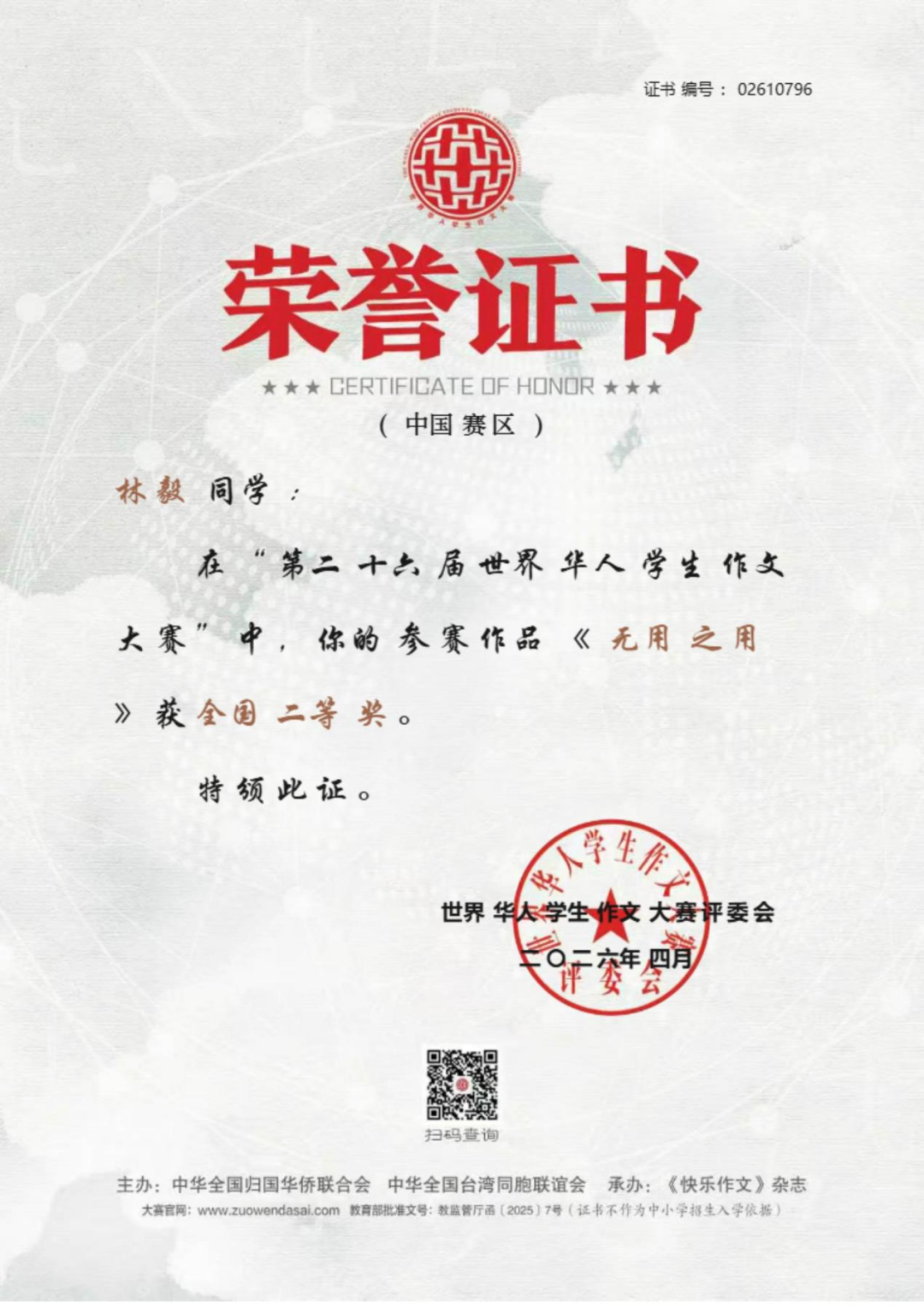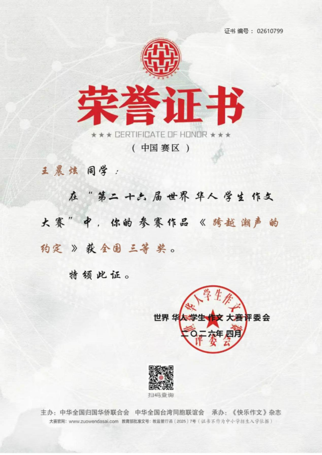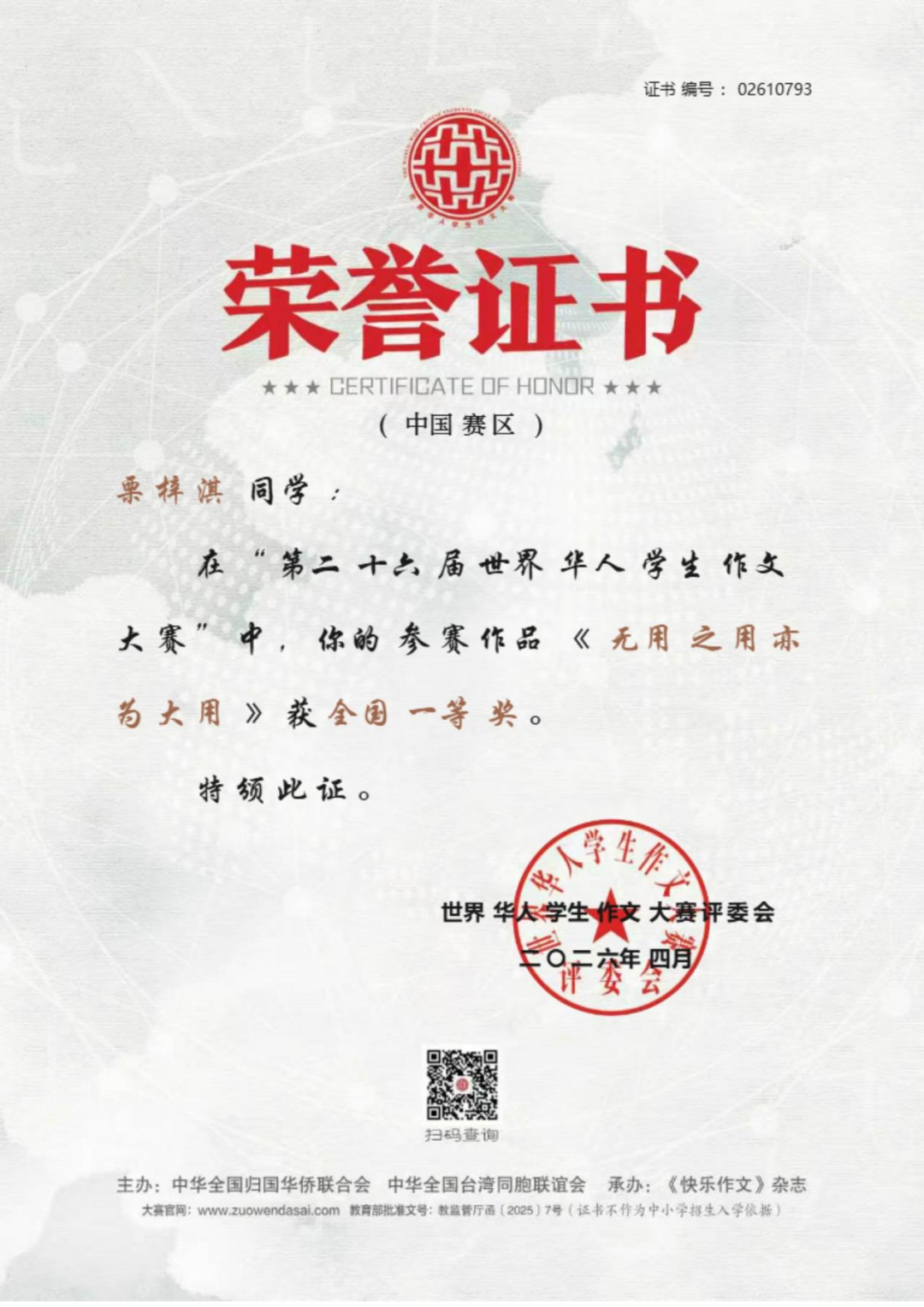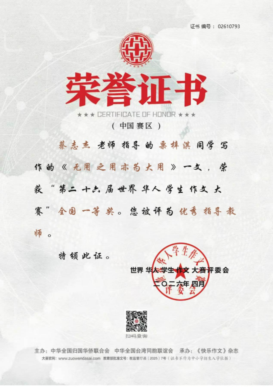 近日,上海外国语大学三亚附属中学捷报频传,学子在国家级文学赛事、全国体育竞技赛事、全国地球科学奥赛及市级艺术展演中接连斩获重磅殊荣,于笔墨书香中绽放人文光彩,在竞技赛场彰显少年锋芒,以卓越的综合素养交出亮眼青春答卷,充分彰显了学校“培养外语见长、文理并举、五育兼备、创新型、复合型、 高素质的国际型预备英才”的育人理念与丰硕的办学成果。 笔底藏山河,青春著华章。在刚刚公布评选结果的第二十六届世界华人学生作文大赛(教育部白名单赛事)中,我校学子不负众望、再创佳绩,共有 7 名学生斩获国家级奖项。其中,高二 (2) 班沈浩年、高二 (7) 班栗梓淇荣获国家级一等奖;高二 (2) 班木子、林毅荣获国家级二等奖;高三 (2) 班王晨炫、高二 (2) 班高凡、高二 (7) 班林珍妮荣获国家级三等奖。赵韵如、蔡志杰、李佑红老师荣获本次大赛优秀指导老师奖。 我校学子获奖证书 上下滑动查看更多图片 优秀指导老师获奖证书 上下滑动查看更多图片 世界华人学生作文大赛作为教育部认可的全国性权威赛事,为广大青少年搭建了展现文学素养、抒发青春心声、表达思想深度的广阔平台。我校学子在赛事中脱颖而出、斩获多项殊荣,既展现了学生们出众的文字功底、丰厚的人文积淀与开阔的视野格局,也凝结着我校语文组全体教师深耕课堂教学、潜心育人育才的辛勤付出,更是学校长期重视学生核心素养培育、厚植校园人文底蕴的生动成果体现! 碧波逐风浪,少年勇争锋。在 2026 年全国蹼泳 U 系列比赛中,我校初三 1 班李睿轩同学代表三亚市出征赛事。赛场上,他凭借日复一日打磨的扎实专业功底、稳定出色的临场发挥与奋勇争先的竞技状态,力克群雄、脱颖而出,一举包揽 U17 组 50 米双蹼、100 米双蹼、200 米双蹼三个项目的全国冠军,以绝对实力登顶赛事最高领奖台。 赛场上每一次有力的划水,都凝聚着李睿轩同学常年挥洒的汗水与不舍昼夜的坚持;领奖台上的荣耀时刻,更见证着他以无畏毅力挑战自我、突破极限的体育精神。这份亮眼的成绩,既是李睿轩同学个人拼搏奋斗的青春勋章,也是我校高度重视学生身心健康与体育特长发展,持续推进校园体育工作提质增效的有力印证。 地载山河探奥秘,格物致知求真知。在刚结束的 2025—2026 年度全国中学生地球科学奥林匹克竞赛预赛(教育部白名单赛事)中,我校地理组师生奋勇拼搏,再创佳绩,获奖数量与质量均位居全省前列! 本次竞赛我校共 24 人次获奖,其中一等奖 8 人次(全省仅 20 人),二等奖 10 人次(全省仅 50 人),三等奖 6 人次(全省共 93 人),获奖占比远超全省平均水平,展现了我校强劲的拔尖人才培养实力。其中,高三(2)班邱彦博同学表现尤为突出,以全省第一名的绝对优势成功晋级全国决赛,成为全省仅有的 2 位入围国赛选手之一。魏春松、刘溪、方燕妹老师荣获本次竞赛优秀指导教师奖。 获奖名单 全国中学生地球科学奥林匹克竞赛是国内地球科学领域级别最高、影响力最广的中学生学科竞赛,旨在激发青少年对地球科学的兴趣,选拔和培养地球科学后备人才,推动中学地球科学教育改革与发展。我校学子在赛事中斩获佳绩,既彰显了学生们扎实的学科功底、严谨的科学思维与探索未知的科学精神,也凝结着地理组全体教师深耕学科教学、精准培优的心血与汗水,更是学校重视拔尖创新人才培养的生动体现! “绳”彩竞飞扬,赛事刷新绩。2026 年三亚市中小学生 “青鹿” 体育节暨第五届中小学生跳绳比赛圆满落幕,我校跳绳健儿奋勇拼搏,斩获中学组团体积分第二名。本次赛事中,我校共摘得个人奖项 15 项,其中冠军 2 项、亚军 4 项、季军 2 项;三项团体项目全部获奖,拿下 1 项亚军、1 项季军,书写了学校跳绳项目的新辉煌。 获奖学子风采展示 上下滑动查看更多图片 赛事不仅锤炼了学子的体魄与意志,更凝聚了团队力量,让 “更高、更快、更强、更团结” 的体育精神深植学子心间。 墨香润童心,展演获殊荣。在刚刚结束的三亚市 “青鹿杯” 艺术展演决赛中,我校三位学子从初赛中脱颖而出,在决赛中取得优异成绩:初一( 7) 班郑雅晴荣获初中组软笔书法一等奖,初一 (1) 班王贺荣获初中组硬笔书法二等奖,高一 (2) 班彭梦博荣获高中组软笔书法二等奖,充分展现了我校学子的艺术素养与审美能力。 上下滑动查看更多获奖作品 多项荣誉的接连斩获,是我校始终坚守立德树人根本任务,深入落实 “五育并举” 教育方针、践行“外语见长、文理并举”育人理念的生动体现。在此,学校向所有获奖学子致以最热烈的祝贺,向悉心指导的语文组、地理组、体育组、艺术组全体教师,以及长期支持学校教育工作的各位家长致以最诚挚的感谢。 少年负壮气,奋烈自有时。愿全体获奖学子珍惜荣誉、乘势而上,在各自热爱的领域再接再厉、勇毅前行;也愿全体上外三亚附中学子以榜样为力量,心怀热爱、笃行不怠,成长为德智体美劳全面发展的新时代优秀青少年! 撰稿:朱伟华、欧阳磊、徐盈、朱暖娥 编辑:石雅娴 编审:苏靖雯 审校:陈太涯